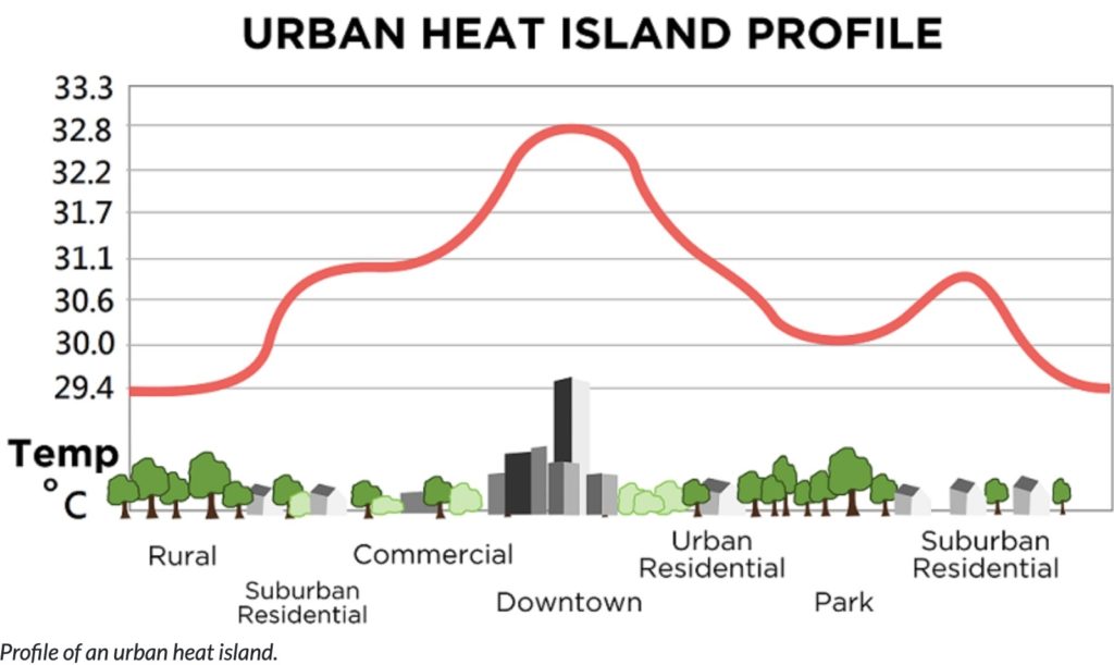 Collectively, these factors create what is called the “urban heat island effect”, whose impact is mostly felt at night when temperatures in urban areas can be up to 5-10°C higher than surrounding areas. This phenomenon stems from the gradual release of stored heat from structures such as buildings and roads.