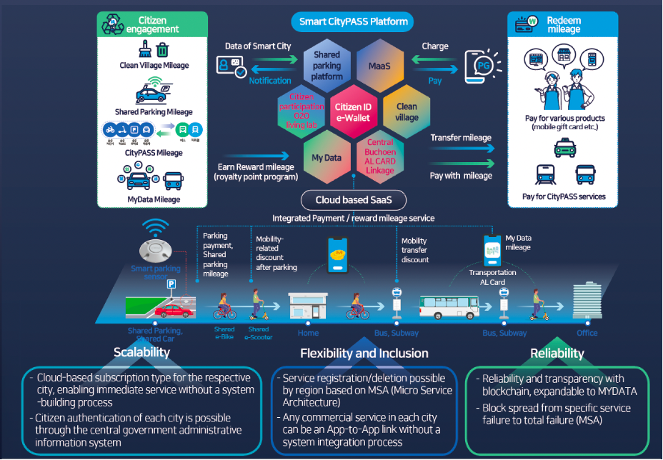 But Bucheon also propose an innovative vision of what a Smart City platform can be for citizens. This takes the form of the Smart CityPASS platform. A solution that promotes citizen engagement as a way to earn “mileage” or loyalty points that can be used to pay for CityPASS services such as mobility services.