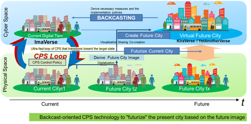 It aims to develop a “super-resolution backcasting CPS platform” based on a virtual city (Digital Twin) future vision. Backcasting is a planning method that starts with defining a desirable future using digital twin technologies to allow citizens and planners to express, in the virtual world, thetype of city they hope to live within in the future. The system then works backwards to identify policies and programs that will connect that specified future to the present.