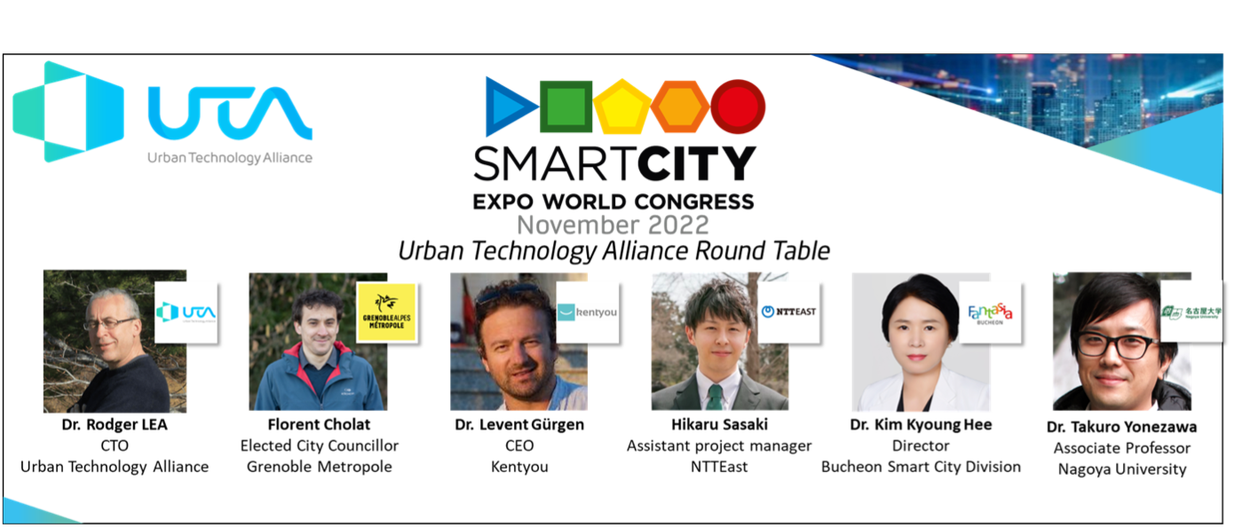 For three days, members of the Urban Technology Alliances joined the Smart City World Expo (SCEWC22) in Barcelona to showcase results of their innovative work. The UTA Booth gathered representatives from Nagoya University, Kentyou, NTTEast, Keio University, Kadinche and PortHofner. Other UTA members, such as the cities of Grenoble, Santander, Bucheon, Taipei and Busan were hosted by Country expo booths, but made time to join UTA at the main booth to talk about their activities.