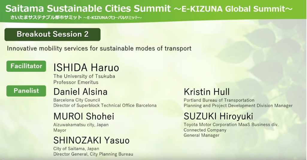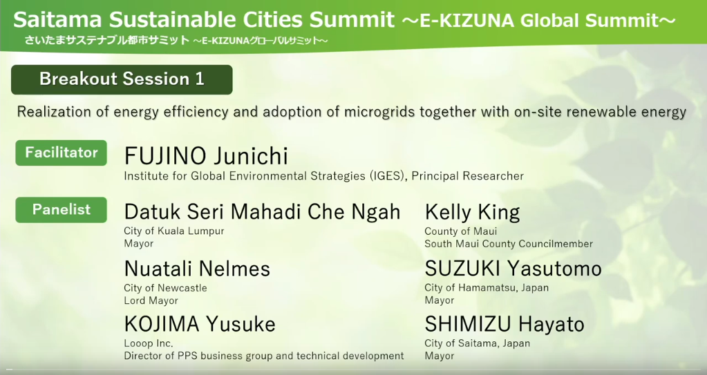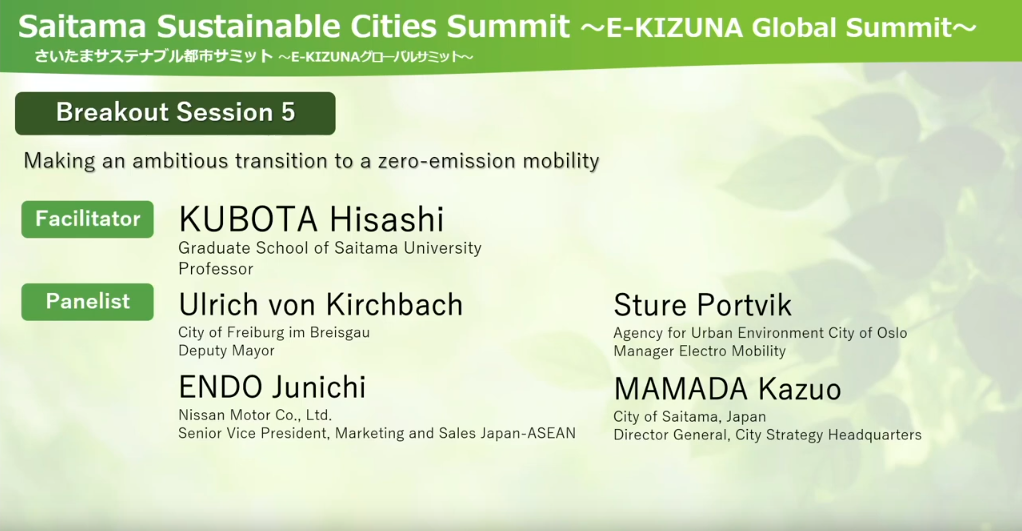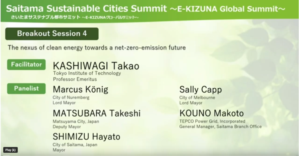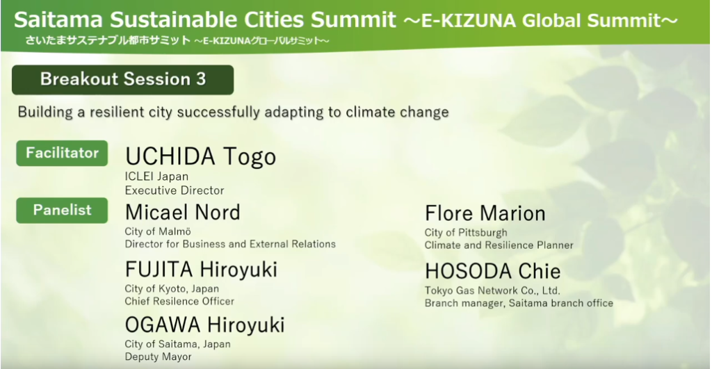 - City of Saitama, Japan has a number of initiatives but has focused on resilience as a common theme. So for example, it has been promoting EVs to combat emissions but also considering their use as a source of power during disaster. They also highlighted smart home success case study