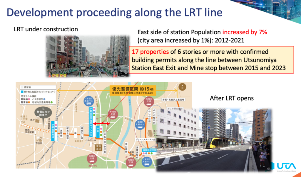 As a use-case, he presented Utsunomiya City which introduced a newly built LRT system in 2023. The LRT system comprises 15km of line spanning the east and west of the city and crossing the major river that divides the city. One key features of the system is that the system runs on 100% renewable energy generated from solar power and waste treatment. This results in an an annual Co2 reduction of 9,000 tons of Co2 in operations.