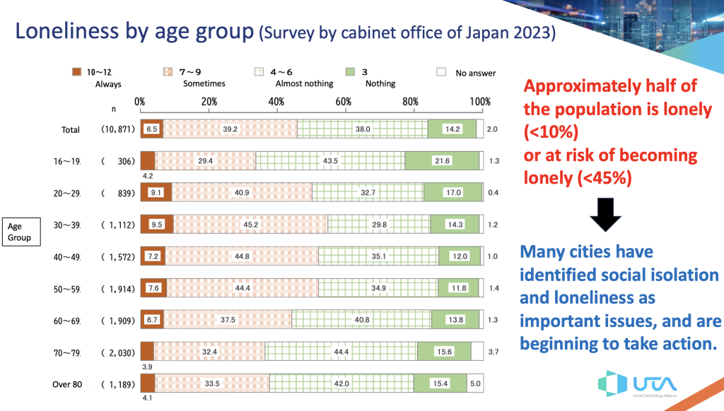 He started his presentation with a survey carried out in Japan that identified loneliness by age group. Although there is a common belief that this is mostly an issue for older people, the survey highlighted this is a common problem across all age groups, and is actually highest in the 30-39 year old age group.